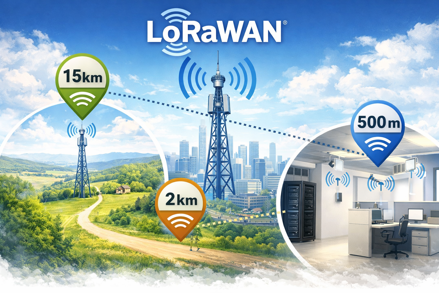 LoRaWAN har en ungefärlig räckvidd på 15 km i öppen terräng, ca 2 km i stadsmiljö eller ca 500 meter inomhus i en byggnad. Allt beror naturligtvis på hur man placerar sina Gateways.