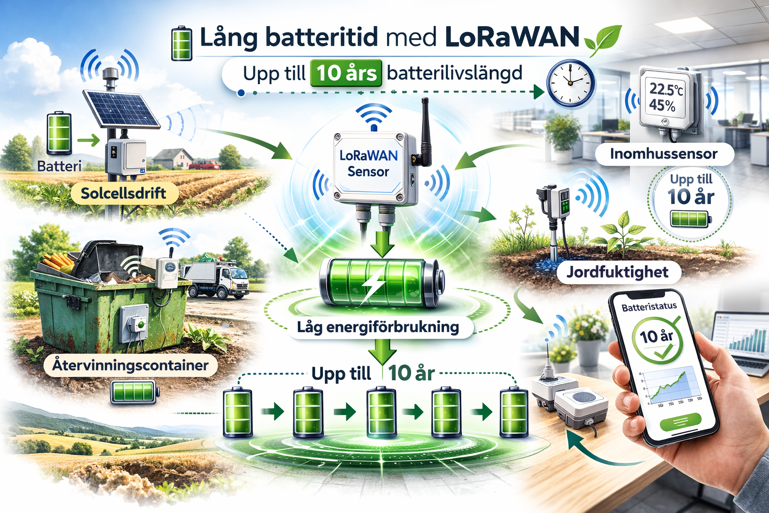 LoRaWAN sensorer drivs oftast på batteri. Tack vare LoRaWAN tekniken så blir LoRaWAN enheterna extremt strömsnåla och i många fall håller batterierna upp till 10 år.